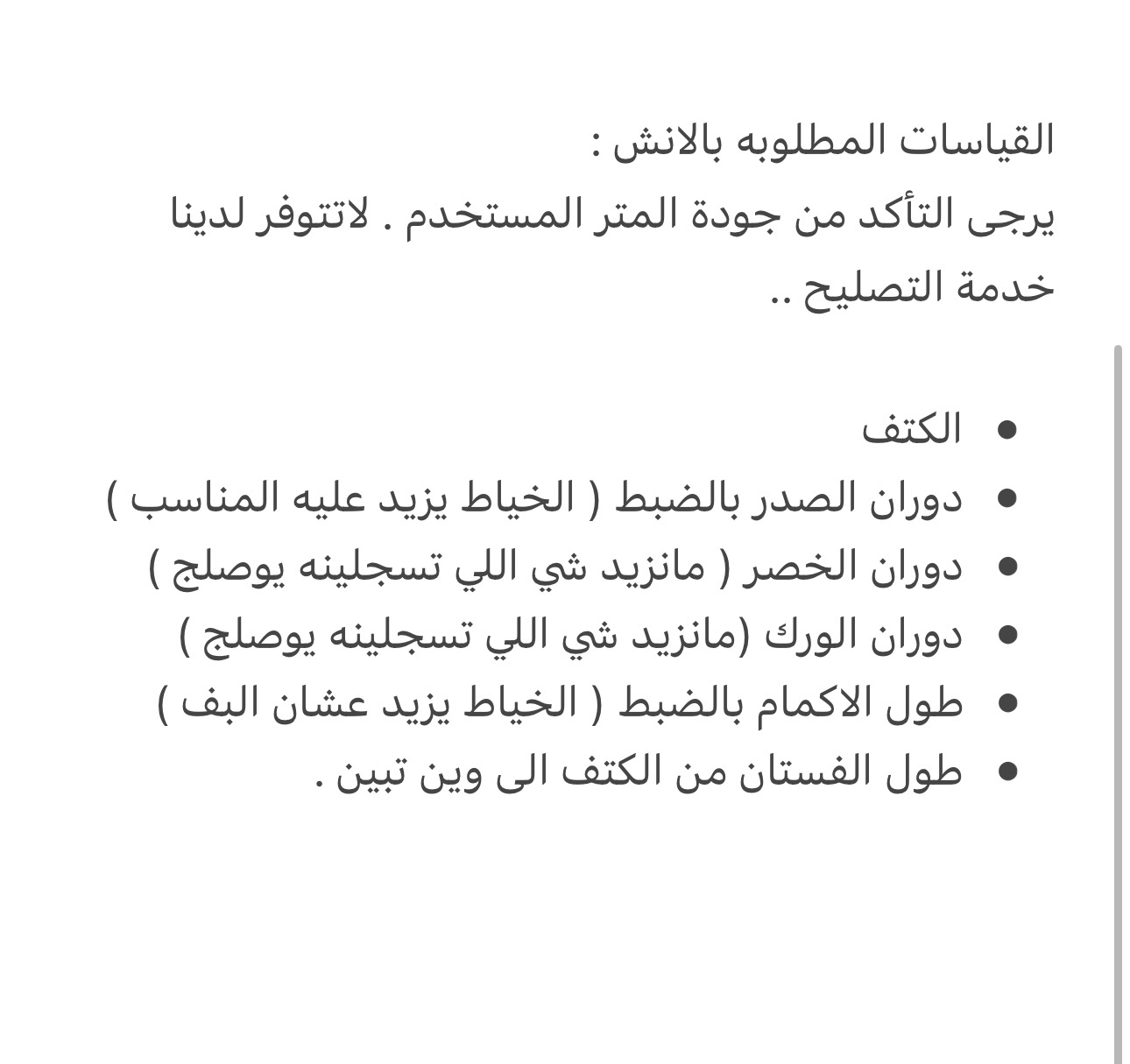 •لايوجد استبدال او استرجاع وذلك لان جميع القطع تفصيل خاص للعميل